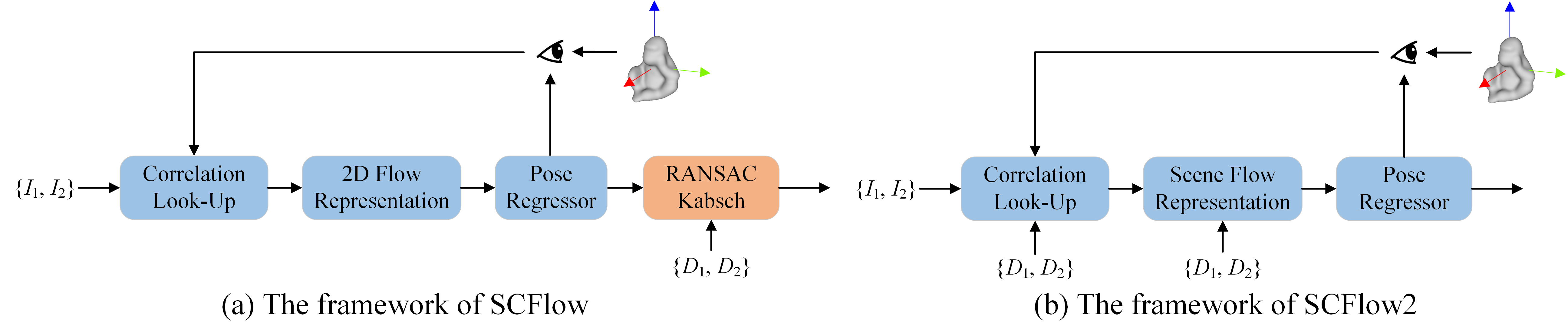 Design overview of SCFlow and SCFlow2. Given the object 3D mesh, we render an image I1 and depth map D1 based on an initial pose, and then use networks to compare these rendered outputs with the real input I2 and D2 to refine the pose. (a) Although SCFlow adds 3D shape constraint into the optimization loop, it formulates the matching process as a pure 2D problem, which is less effective in capturing 3D motions. On the other hand, it cannot work with RGBD images. A common practice is to use RANSAC Kabsch to consume additional depth as a second stage, which however is only locally optimal within each stage. (b) SCFlow2 tackles these problems. We introduce an intermediate representation based on 3D scene flow to capture 3D motions in network optimization. Furthermore, we embed depth into the loop by formulating depth as an additional regularization to guide the correlation look-up iteratively, producing an end-to-end trainable system with RGBD images.